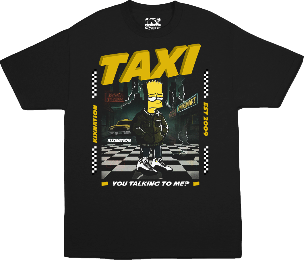 Customized Black T-shirt by Kixnation, matches Jordan 12 in the “TAXI” Colorway.