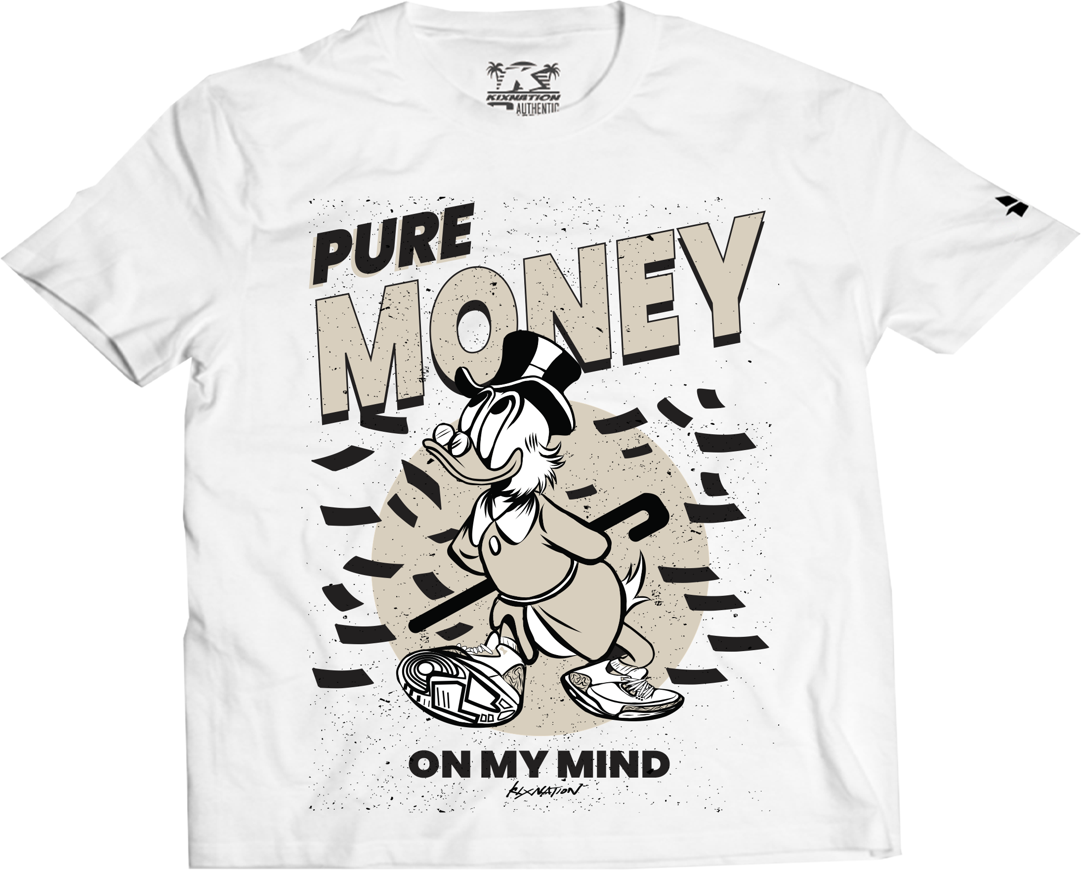 Customized White T-shirt by Kixnation, matches Jordan 3 in the “Pure Money” Colorway.